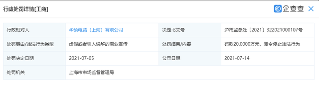 日前,华硕电脑(上海)有限公司新增一则行政处罚公示,处罚事由为虚假或者引人误解的商业宣传,罚款20万元。