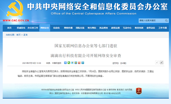 16日,国家网信办等七部门进驻滴滴开展网络安全审查。