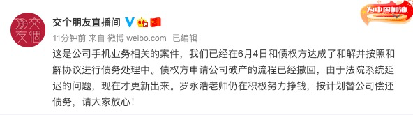 对此,交个朋友直播间回应,已经在6月和债权方达成和解,债权方申请公司破产的流程已经撤回。
