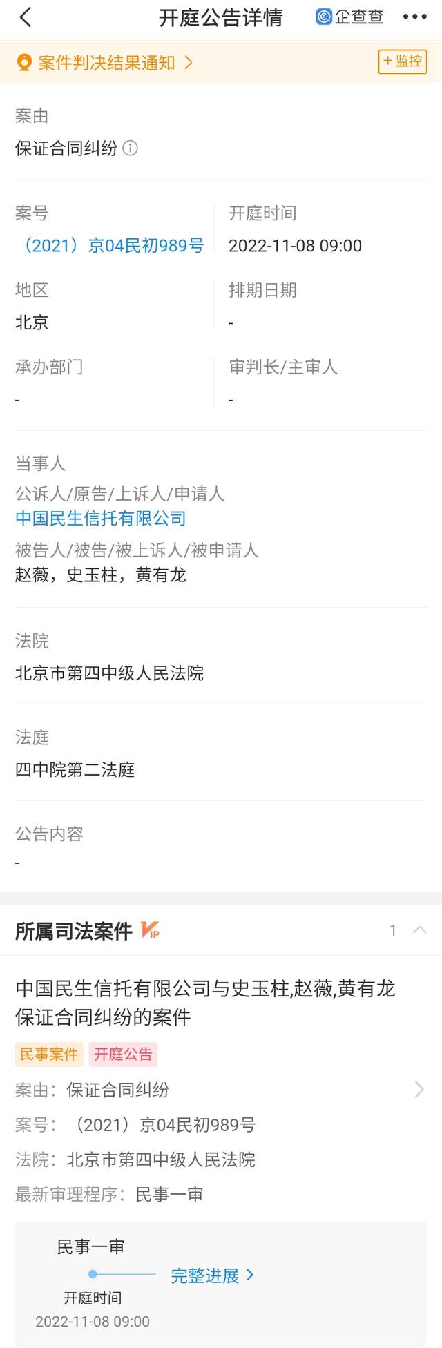 中国民生信托有限公司将赵薇及其丈夫黄有龙、巨人网络集团董事长史玉柱三人告上法庭。公告显示,此案由为保证合同纠纷,将于11月8日开庭。