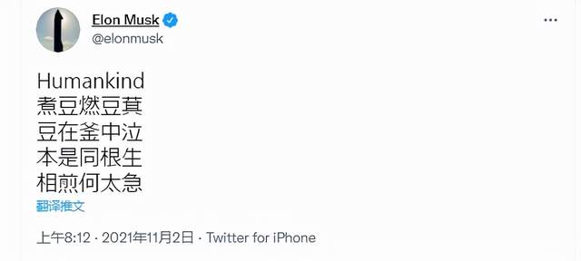 11月2日,特斯拉CEO马斯克在推特和微博上发了一首三国时期魏国诗人曹植的《七步诗》。这首诗用萁煎其豆来比喻同胞骨肉的哥哥曹丕残害弟弟,表达了对曹丕的强烈不满。