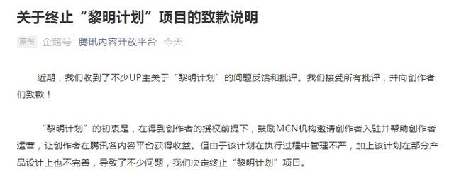 腾讯叫停企鹅号黎明计划并向UP主道歉