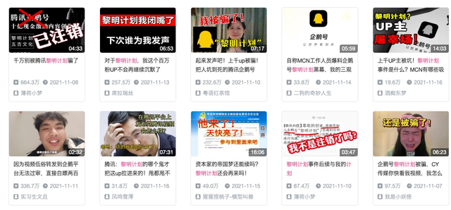 此前,黎明计划曾被多名UP主控诉,黎明计划进驻企鹅号后,不仅没有流量没有收入,在B站原有内容也会被下架。