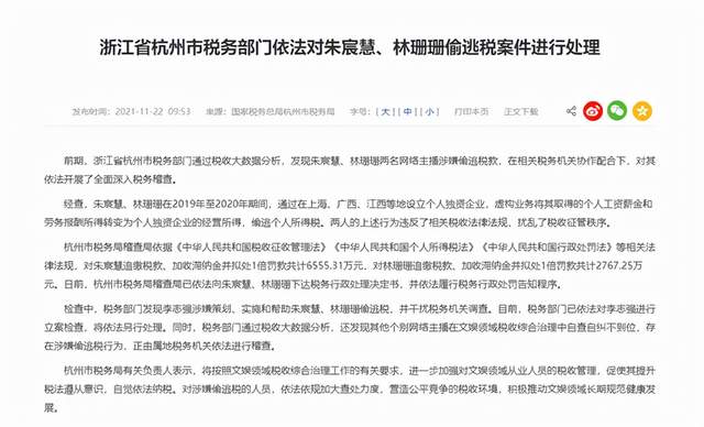 官网显示:经查,朱宸慧、林珊珊通过设立个人独资企业,虚构业务将其取得的个人工资薪金和劳务报酬所得转变为个人独资企业的经营所得,偷逃个人所得税。