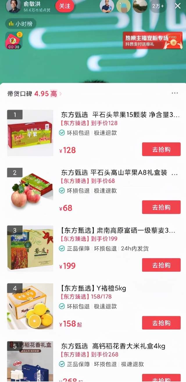 俞敏洪带货首秀成绩单:当晚主播榜16位,观看人数182万人次,订单总量5.7万,打赏收入在10万元-50万元之间,销售额为481万元……