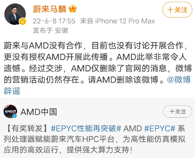 起初,AMD中国发文称,AMD某款处理器赋能蔚来汽车HPC平台。结果被蔚来高管否认:与AMD没有合作,更没有授权AMD开展此传播,希望AMD删文。