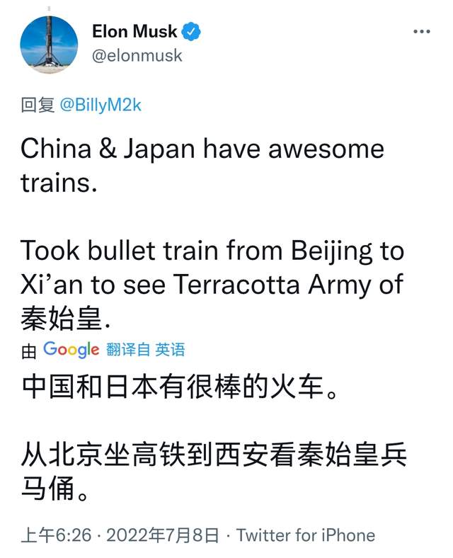 马斯克:“中国和日本的火车都非常赞。我曾经乘坐中国高铁,从北京去西安参观秦始皇兵马俑。 ”