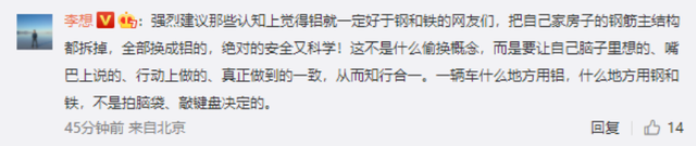 李想还发布了一条目前已删除的留言,内容提到:“强烈建议那些认知上觉得铝就一定好于钢和铁的网友们,把自己家房子的钢筋主结构都拆掉,全部换成铝的,绝对的安全又科学……一辆车什么地方用铝,什么地方用钢和铁,不是拍脑袋、敲键盘决定的。”