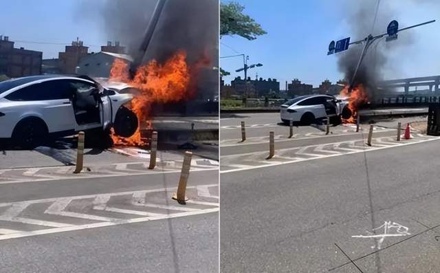 台媒:桃园市一辆白色特斯拉自撞桥梁机车分隔岛,整辆车起火燃烧,车头明显全毁。