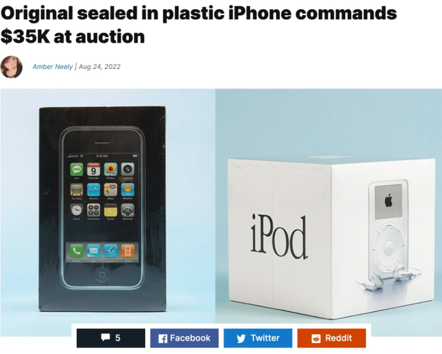此外,拍卖中还包括未开封的iPod 1代,售价为25000美元(约17.1万元人民币)。