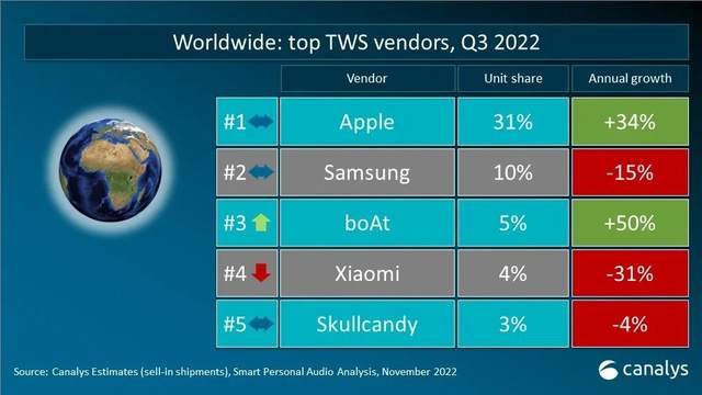 全球出货量前五:苹果(31%)、三星(10%)、boAt(5%)、小米(4%)、Skullcandy(3%)。